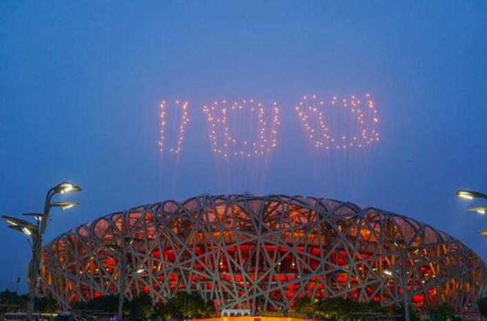 庆祝中国共产党成立100周年文艺演出《伟大征程》在国家体育场盛大举行。这是焰火盛放在国家体育场上空。